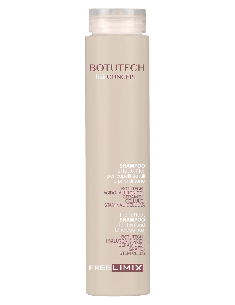 Το σαμπουάν Botutech καθαρίζει απαλά, δυναμώνει & "διογκώνει" τα μαλλιά. Χάρη στο υαλουρονικό οξύ, τα ceramides & τα βλαστοκύτταρα σταφυλιών, αφήνει τα μαλλιά & με όγκο. Ενυδατώνει & προστατεύει τα λεπτά μαλλιά χωρίς να τα βαραίνει. Βελτιώνει την ελαστικότητα τους & τα καθιστά δεκτικά στα οφέλη του filler.