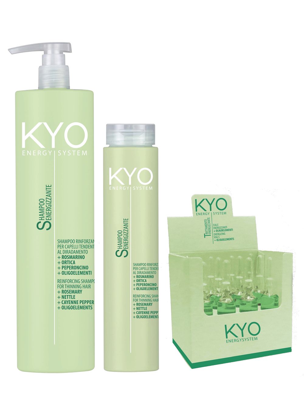 Εμπλουτισμένο με ιχνοστοιχεία, δεντρολίβανο, τσουκνίδα & εκχυλίσματα πιπεριού, το energizing-reinforcing σαμπουάν της KYO Energy System, καθαρίζει σε βάθος & εξισορροπεί το τριχωτό της κεφαλής & βοηθά στην πρόληψη της αραίωσης. Παράγοντες διέγερσης βοηθούν στην θρέψη & την ενίσχυση της τρίχας από την ρίζα. Αυτό δίνει στο δέρμα μια άμεση αίσθηση φρεσκάδας & ευεξίας.
